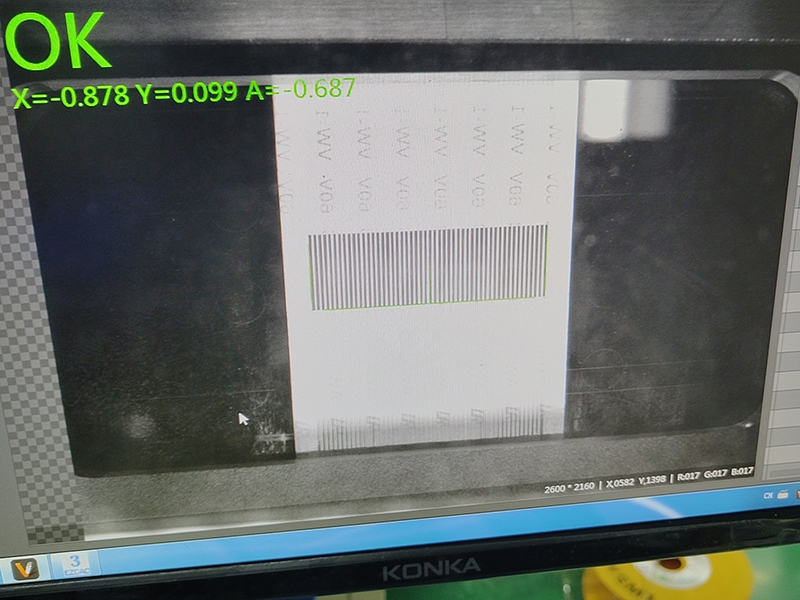 2.2、纠偏控制机构:旋转纠偏平台左边为伺服驱动的线性模组并且支撑点可以旋转,右边为伺服驱动线性模组并且支撑点具有X方向的自由度。通过前后纠偏机构识别特征边,旋转纠偏平台进行微动,保证识别的两个特征边所连起来特征线倾斜角度在绝对坐标系下保证为0。此外通过视觉识别机构识别产品的MARK点,控制伺服电机驱动的前后送料压轮机构,保证产品前后镭射位置绝对精确。