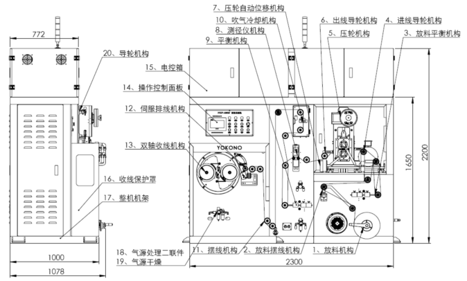 1.1、压轮轧辊机构:采用精密合金轧辊上下同步对压方式实现圆母线压扁,轧辊上下调节压扁宽度采用手动和自动相结合的方式实现精密调节压扁宽度;压扁宽度采用精密激光测径仪在线实时监测反馈给控制中心,实现在线实时纠正压扁宽度精度,确保压扁宽度尺寸精度稳定可控。