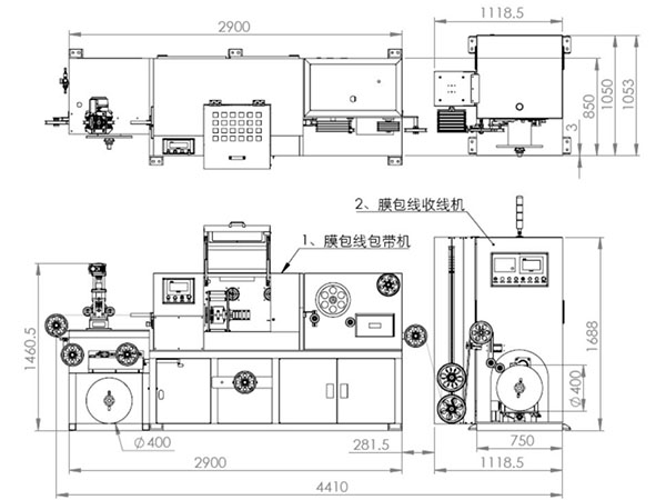 2.3、膜包扁线主机控制方式:采用PLC及触摸屏操作界面控制模式,可设定线径规格尺寸、重叠率、运行速度、包膜张力等相关操作参数。