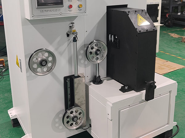 2.2、四方压延机2:采用4轮电动可调方形尺寸的结构设计,在触摸屏上设定扁线宽度和厚度参数后,伺服自动调整四方压延机的规格尺寸,压轮的0位具有预防压坏功能;定形四方压延机压轮为120钢轮;膜包方线的成品宽度和后厚度的公差尺寸可以实现数字设定后一键微调整处理,非常方便操作员对压方成品的尺寸设定和调整。四方压延机的四个压轮均有同步的动力驱动、确保膜包线的4面在挤压变形时的摩擦力很小、极好地保护包膜的表面质量。