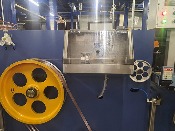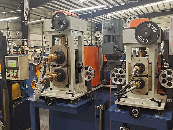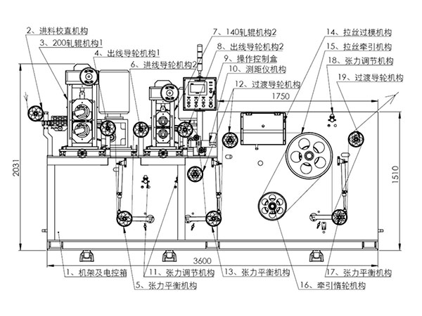 1.1、压轮轧辊机构:采用精密日本合金轧辊上下同步对压方式实现圆母线压扁,轧辊上下调节压扁宽度采用手动和自动相结合的方式实现精密调节压扁宽度;压扁宽度采用精密激光测径仪在线实时监测反馈给控制中心,实现在线实时纠正压扁宽度精度,确保压扁宽度尺寸精度稳定可控。